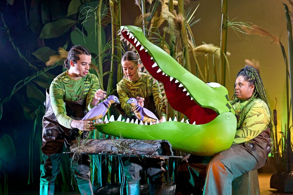 The cast operates a jungle-worth of puppets designed by co-director Toby Olié’s. The best are the smaller puppets on display; a pair of frogs, a pair of birds, and the Egyptian plovers, and he manages to give a sense of the scale of the enormous crocodile, the elephant and the hippo without dwarfing Fly Davis’s botanical set. That said, Williams-N’Dure does look to struggle a little at times with moving the cumbersome ride-on crocodile puppet with a feeling that a higher seat wouldn’t go amiss.