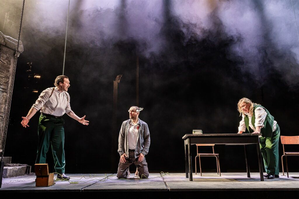 A year on from the success of the Lyric Theatre and Prime Cut Productions’ co-production of Martin McDonagh’s The Beauty Queen of Leenane, this dynamic pairing presents McDonagh’s The Pillowman on the Lyric’s main stage. The play tells the story of a writer, Katurian (Keith Singleton), living in a totalitarian state, who is interrogated by two cops (Steven Calvert and Abigail McGibbon) about his stories and the resemblance they bear to child murders happening in town. Entering the auditorium, the audience encounter a stage in darkness, before a dull spotlight focuses on the middle of the stage revealing a person seated at a table, head covered by black cloth and nervously waiting, leg shaking and displaying unsettled movements, giving us a glimpse of the unnerving world the audience are about to delve into.