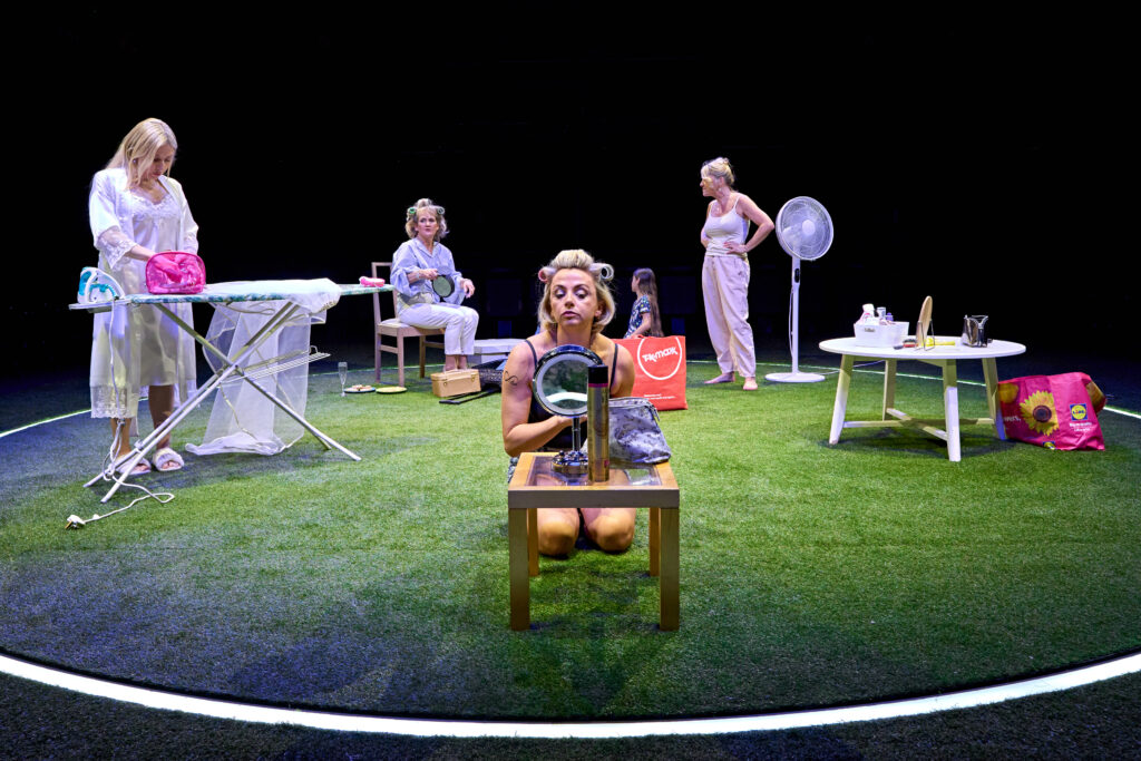 It’s Sylvia’s wedding day, the action opening in the morning as the sisters put the finishing touches to their make-up, before following the events of the day to the chaotic early hours of the next morning, through speeches, dancing to Britney, and actions increasingly fuelled by inebriation, i.e the referenced punch-up. The astroturf-laden, in-the-round design by Samal Blak casts us as guests at the wedding – Tony (the understated Alan Williams) delivering his Father of the Bridge speech from the top table as if we are the extended friends and family.
